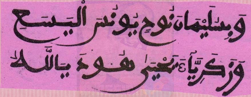 wa bi sulaymâna nuhine yunussal yassahi wa zakariyâ-a yahyâ hudda yallahou |